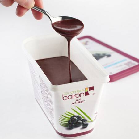 Frozen. Brix 4.5; 2.5 - 6.5.No added sugar. Acai is a berry native to Brazil. It's a superfruit, well known for its antioxidant and fibre content. Les vergers Boiron has selected fruit grown according to agroforestry practices (wild, uncultivated harvest), which protects the biodiversity of the forest. The berries are hand-picked by a cooperative of 19 pickers. ✓ Puree without added sugar ✓ Selection and traceability of fruit ✓ Fruit picked and processed within 24 hours to guarantee product quality ✓ A trendy fruit, to breathe life into the range and match healthy eating habits ✓ Aromatic notes of red fruits and cocoa Optimum uses: acai bowls, sorbets, smoothies, creams, pastry creams.Flavour combination: red fruits, banana, blueberry, coconut, blackberry, black cherry, chocolate, vanilla, chestnut, carrot, and more.Origin: Brazil.