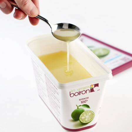 Frozen. Brix 8; 6 - 10.100% fruit - no added sugar. Sudachi is a small citrus fruit bursting with juice (a cousin of Yuzu), which is picked when still green, as its aromatic richness is revealed before full maturity. Les vergers Boiron has selected fruit picked by hand, confidentially grown in Japan. ✓ Puree without added sugar ✓ 100% traceability of fruit (Japan) ✓ Confidential production ✓ Offers a solution to new dietary trends ✓ Aromatic notes of spices, pepper and essential oils Optimum uses: sorbets, drinks, creams, mousses, confits, sauces.Flavour combination: coconut, mango, pear, cereals, green shiso, basil, almond, hazelnut, chocolate, tonka, praline, gin, and more.Origin: Japan.