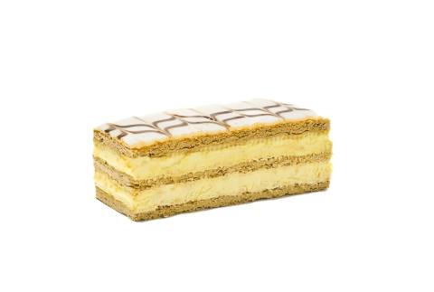 Our three-layered millefeuille, crafted from three buttery pastry slice is generously filled with crème pâtissiere and elegantly adorned with white fondant and a delicate brown feathering. Instructions: It requires defrosting for 3 hours at room temperature or 5 hours in the fridge, then this delightful dessert has a shelf life of 48 hours. Do not refreeze after thawing. Allergens: May contain eggs.