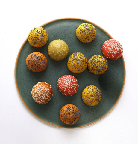 25 orange buns with poppy seed, 25 red buns with sesame seed, 25 yellow buns with poppy seed, 25 green buns with polenta.