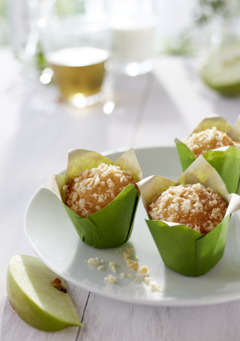 Muffin filled with apple compote and cinnamon, topped with crumble and nicely wrapped in a green paper.