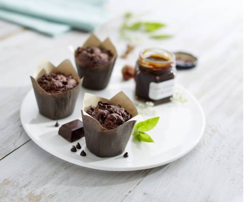 Muffin filled with chocolate and hazelnut, topped with chocolate chunks and nicely wrapped in a black paper.