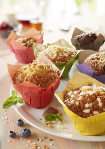 Muffin filled with lemon and apple compote, topped with pearl sugar and nicely wrapped in a yellow paper.