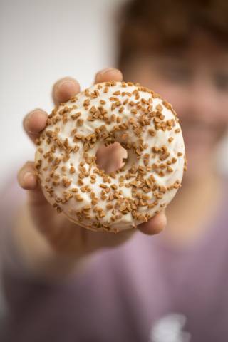 Soft dough filled with caramel cream, with white chocolate coating, and decorated with a crunchy caramel topping.